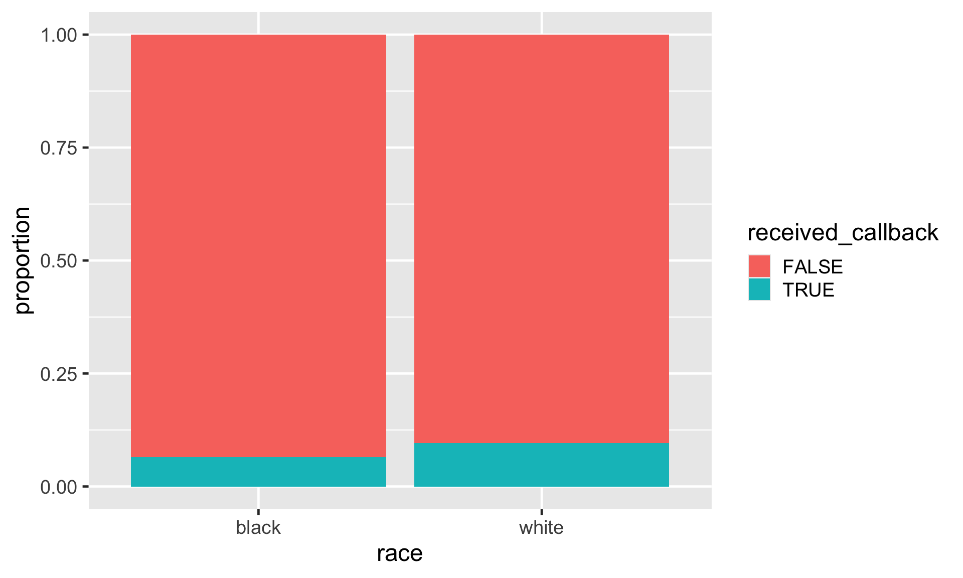 ggplot (resume, aes (x = race, y = received_callback)) +